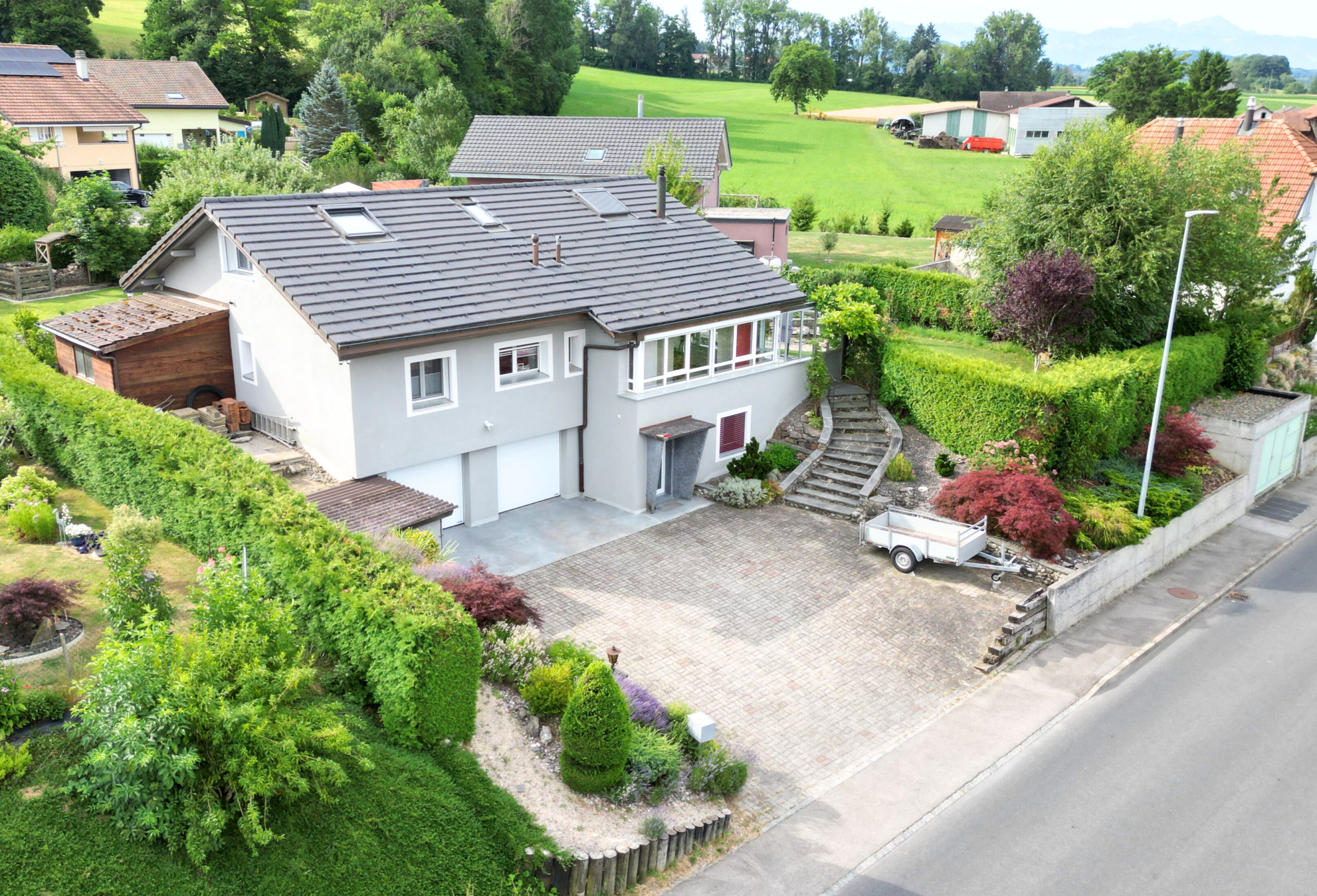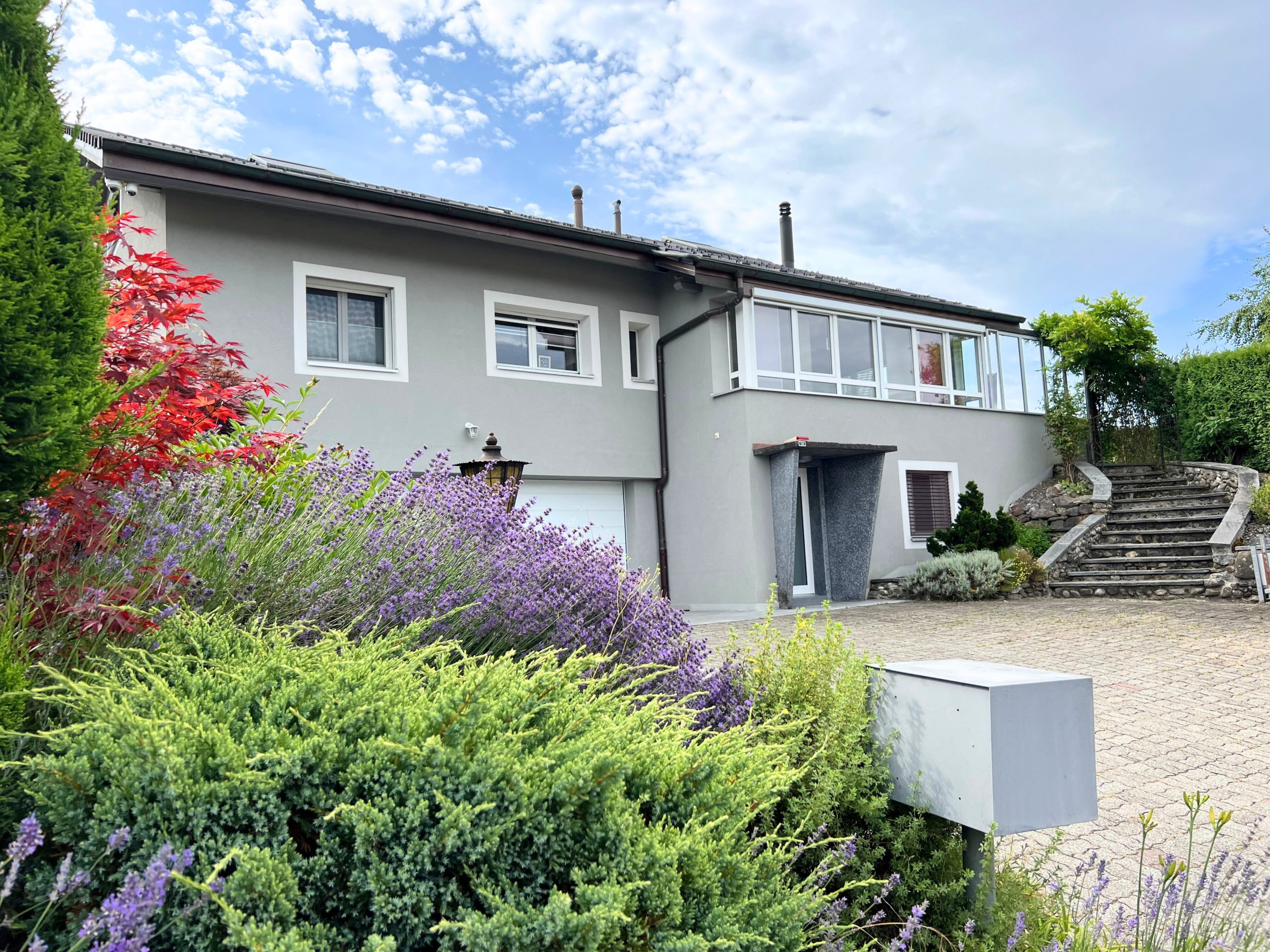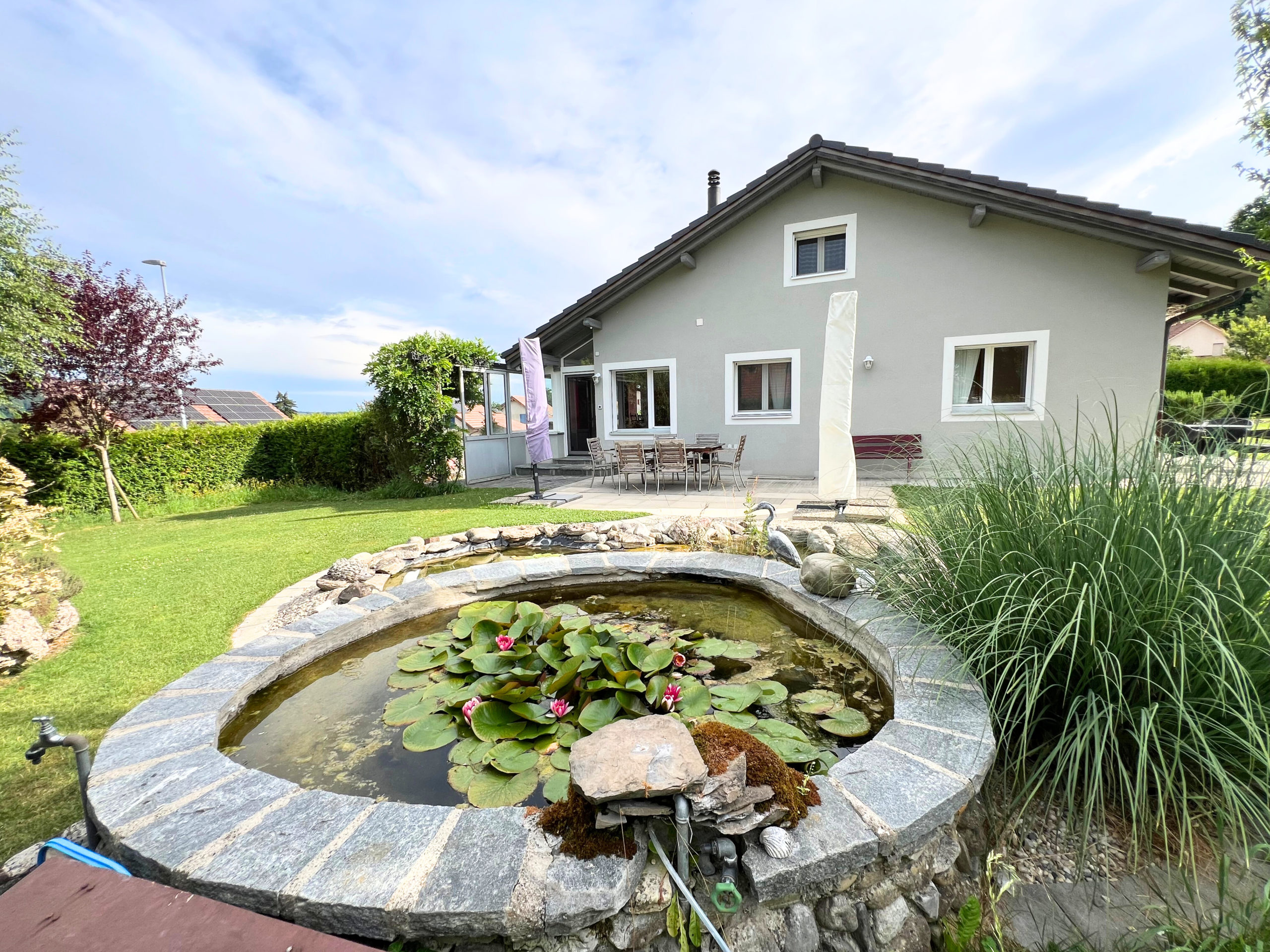 À vendre à Promasens, cette villa individuelle d’exception de 6.5 pièces réparties sur trois niveaux offre environ 185 m² habitables sur une généreuse parcelle de 1’094 m².