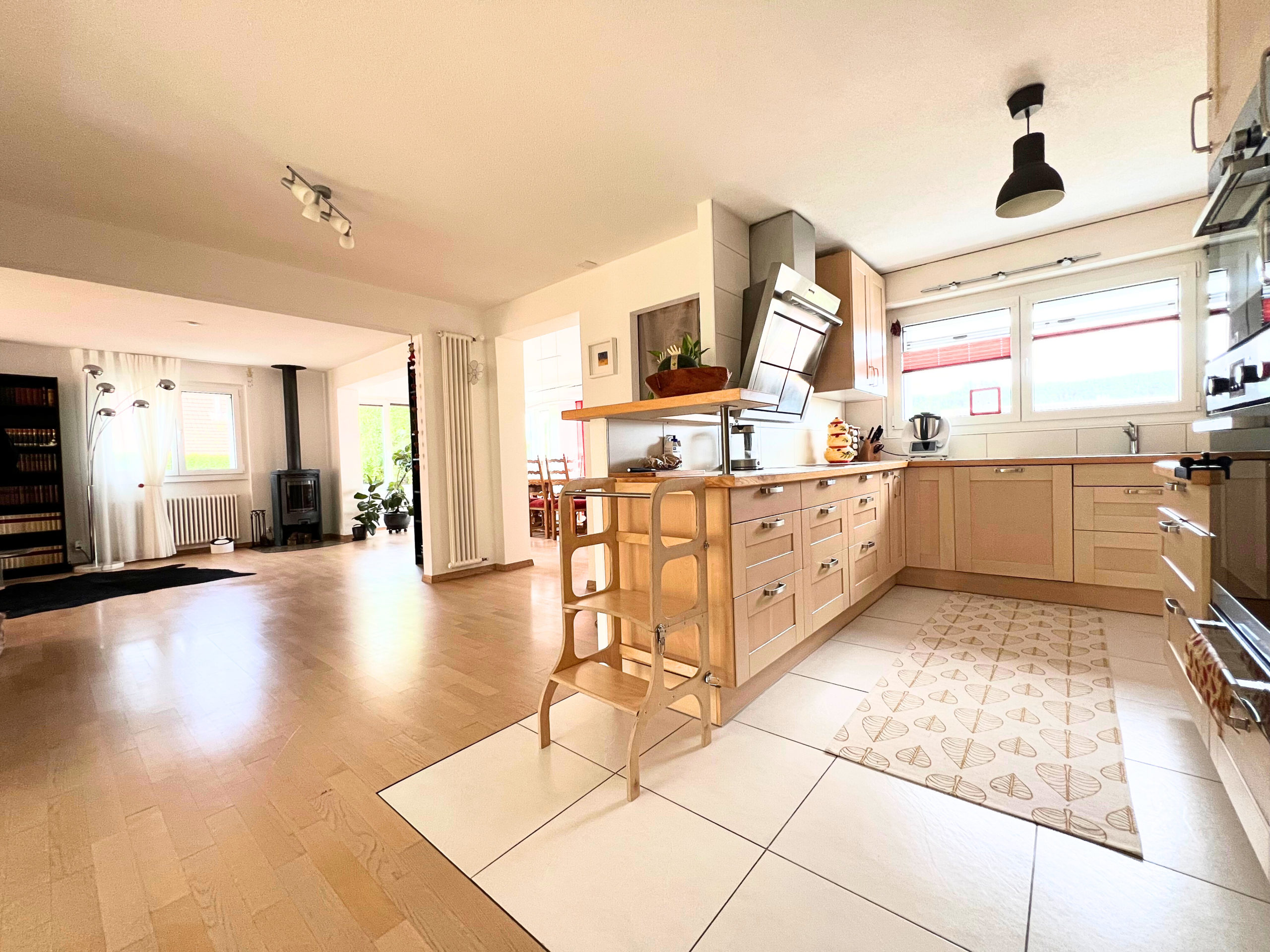 Spacieux séjour, salle à manger lumineuse, cuisine équipée avec cellier